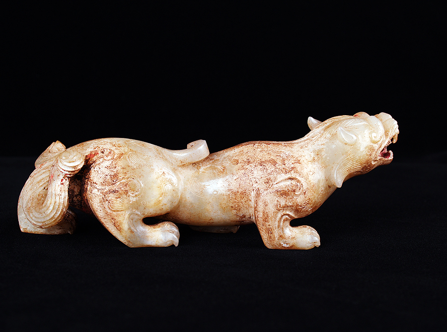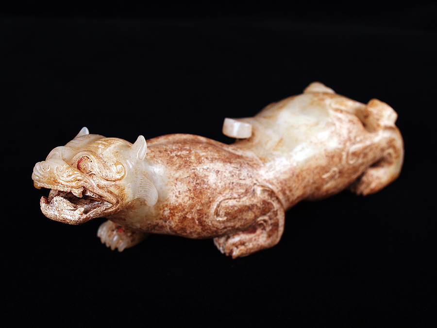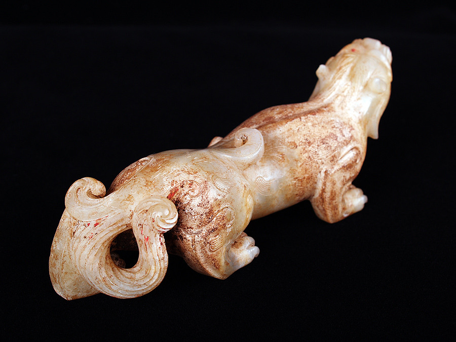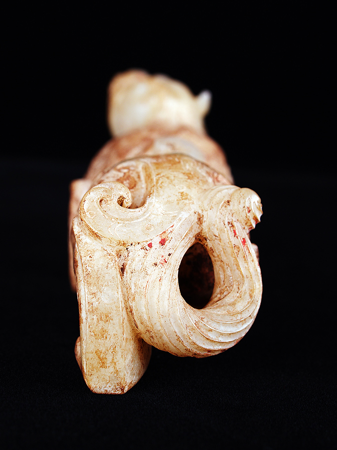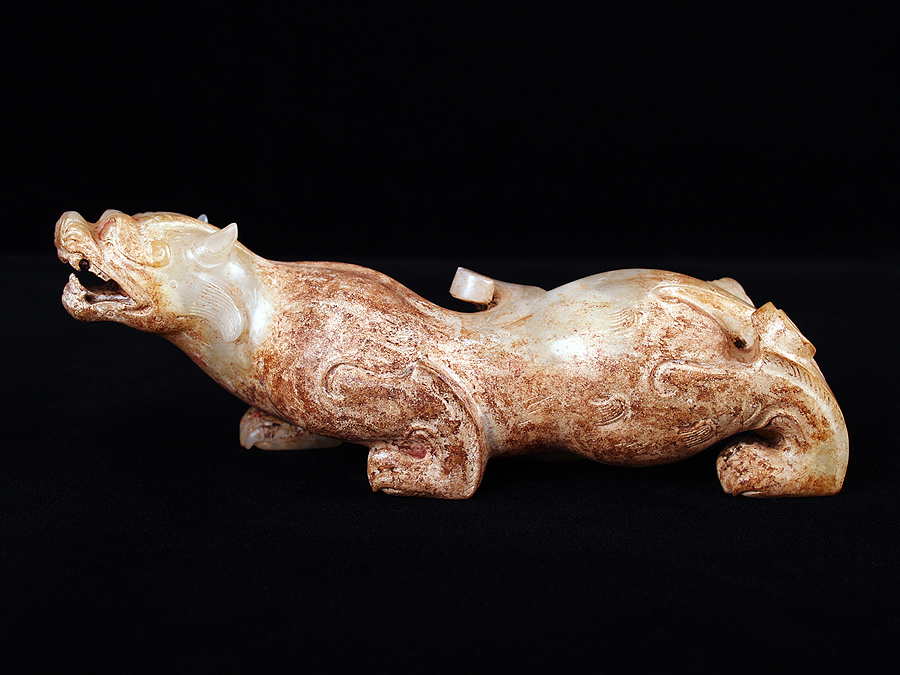 品名 雙角豎耳辟邪 時代 西漢 類別 玉石器 功能 動物 尺寸 借展 發表 說明 尺寸 首尾長:13.6 左右寬:3.4 * 3.6 高:4.6 重:230.0 資料來源 《震旦漢玉》,P.194 參考文獻
